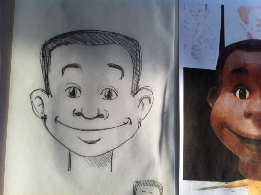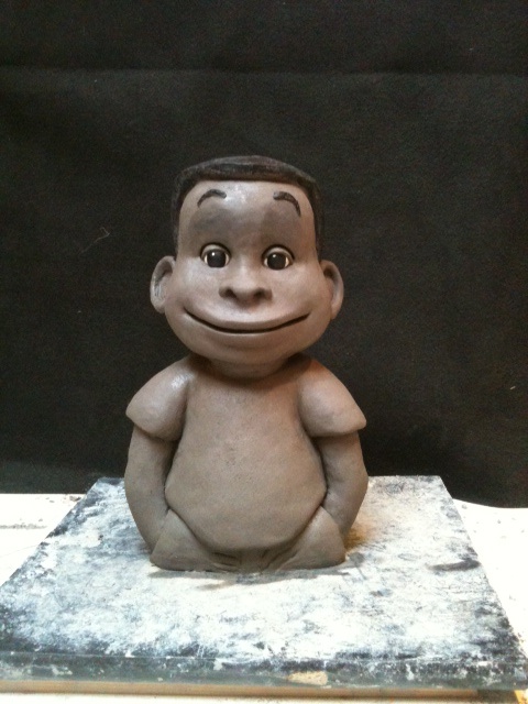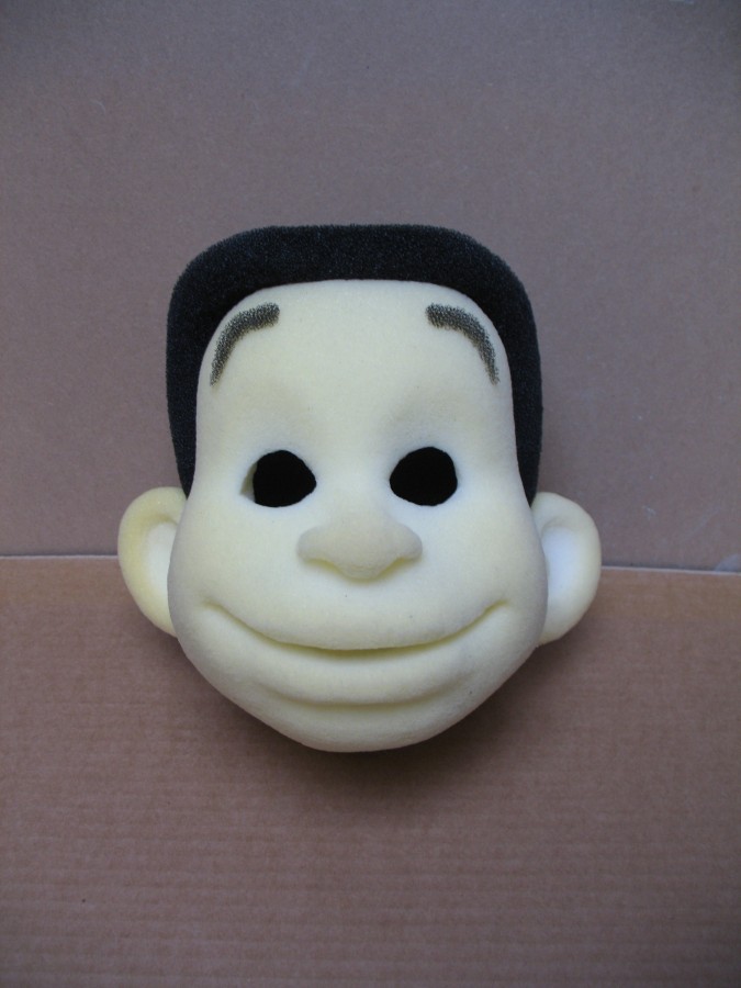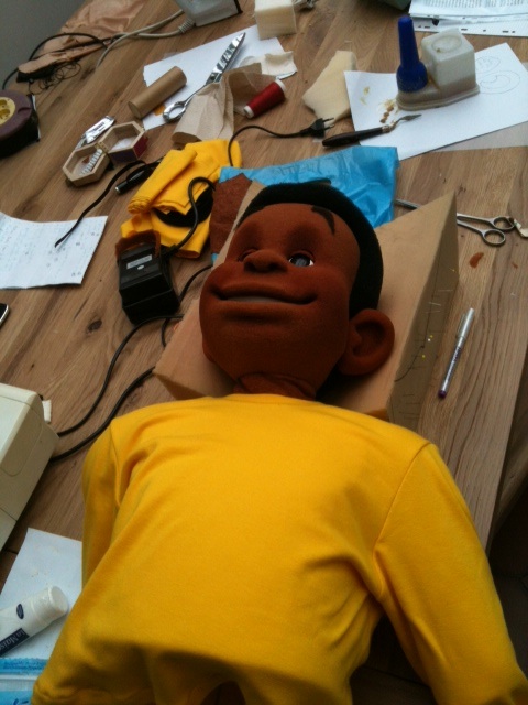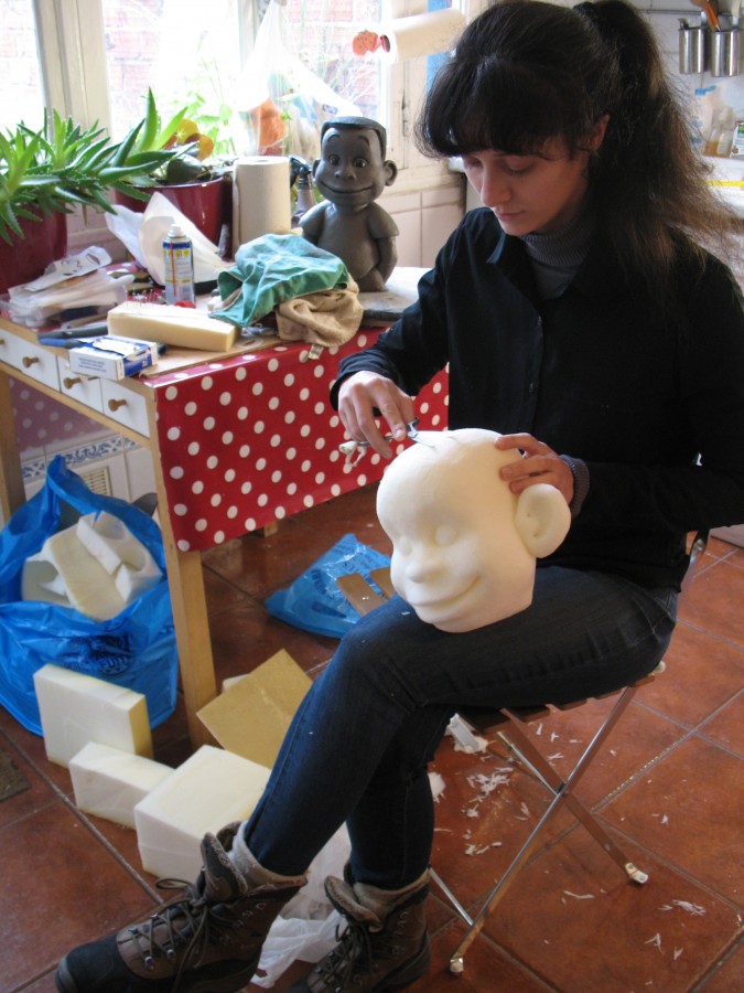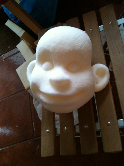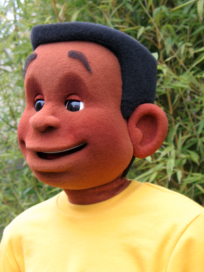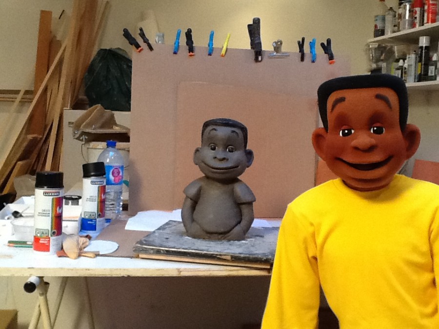 BAO enfant de Mayotte Fabrication d'un personnage tiré d'une bande dessinée représentant l'enfant Bao, un petit reporter curieux. BD de Bao Dessin de Bao réalisé par Vincent Liétar Modelage de Bao Sculpture en mousse taillée Mousse brute Sculpture de la perruque Bao après la peinture Bao à côté de son prototype Bao à Mayotte Contacter puppet ink